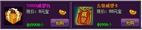 6.调整【背包】右边【今日推荐礼包】开服第一天礼包类型,取消原来特价提悟包、特价洗灵包的售卖,增加5五级威望卡每天不限量购买、5000威望包每天限量1个购买。
