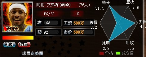 活动期间累计充值5000饭卡送充值礼包C一个,包括:球星卡X2+底薪替补卡X2+新手礼包X1+千里眼X10+内讧X10 +NBA挑战卡X10+ +高级双倍人品卡X5(价值921饭卡),同时获得巅峰艾弗森一个,超底薪500W,有效期15天。