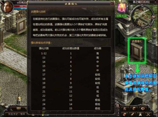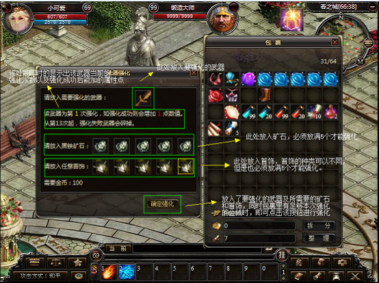 1、在锻造师处即可进行武器强化。华景村(99,32)和春之城(66,38)分别有一位锻造师。