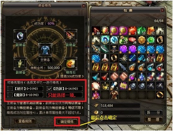 选择精炼的属性增加不能超过7点的限制。(也就是说如果原来的主装备上的某项属性已经附加了7点的极品属性,则精炼不能对此属性再次精炼)