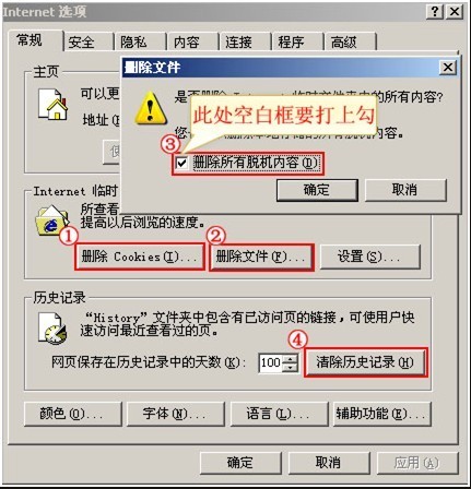 3、之后勾选“删除所有脱机内容”再点“确定”。删除后返回“Internet选项”窗口。