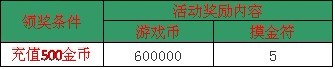 【活动内容】:活动时间内,每日充值满500金币即可领取丰富奖励一份。