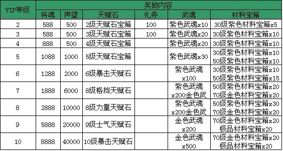 【活动内容】:活动时间内,VIP等级达到指定等级即可获得相应的VIP礼包奖励,礼包内含更多助您踏上强者的道具物品,不容错过!